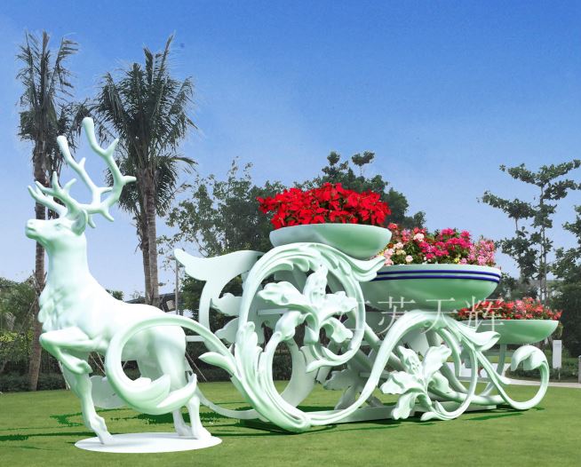 寓意:采用独特梅花鹿、祥云、花盆花架组合而成,仿佛是梅花鹿听到人们轻轻靠近的脚步声,机灵地竖起灵敏的耳朵,瞪着明亮的双眼,灵活的眼珠转来转去看了看四周,正准备奔跑的感觉,又仿佛正在友好地向我们打招呼,灵活又美丽动人!